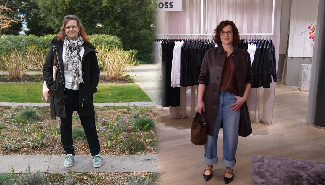 Im Partnerlook mit Luisa geht es anschliessend zur Trendfarbe Aubergine. Aus ihrer neuesten LUISA ROSSI Collection wählt die Stylingexpertin ein Viskosetop sowie eine perfekt sitzende Blue Jeans. Die Slingpumps von THEA MIKA werden mit ihrer Croco-Lederstruktur zum absoluten It-Piece. Der ideale Begleiter dazu ist der Ledermantel von THE KOOPLES, der sich vielseitig kombinieren lässt. Die Tasche von LABEL17 rundet das Gesamtbild harmonisch ab.