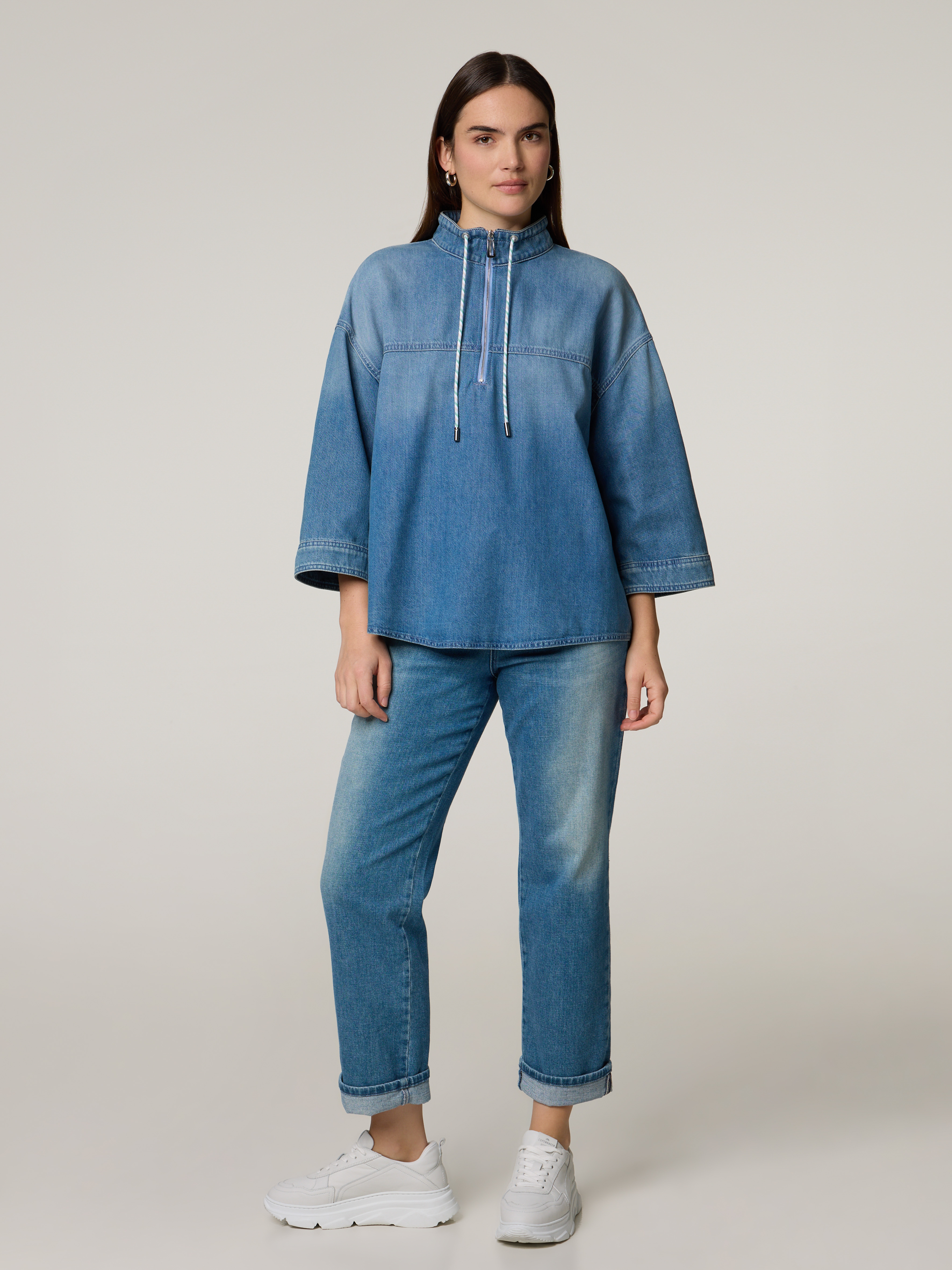 Unser Model misst 172 cm und trägt Grösse 38.
