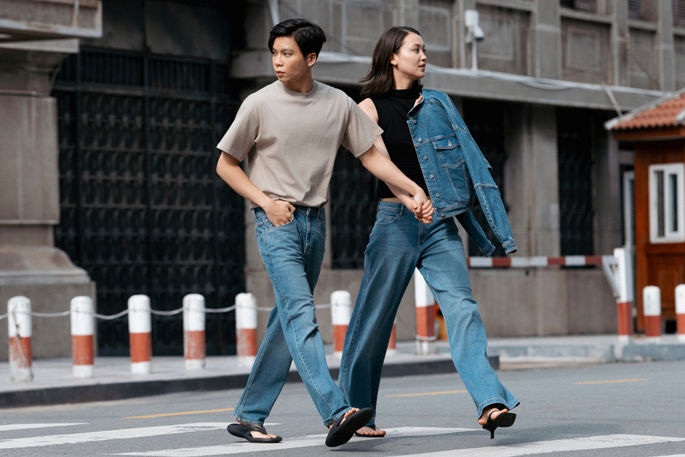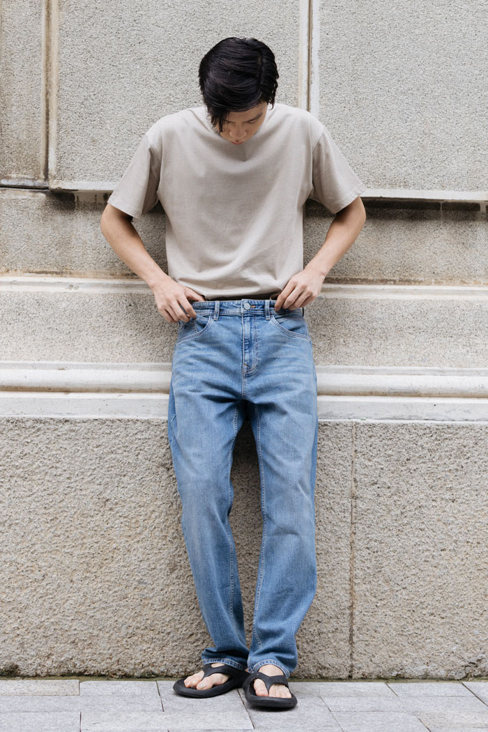 Denim steht im Zentrum der Kollektion. Unterschiedliche Waschungen und Farbnuancen – von tiefem Indigo bis zu helleren, gewaschenen Varianten – zeigen die Vielseitigkeit des Materials. Die Silhouetten DUSK und RISE bilden den Kern der Linie und stehen für eine klare, gerade und eine modernere, entspanntere Proportion.