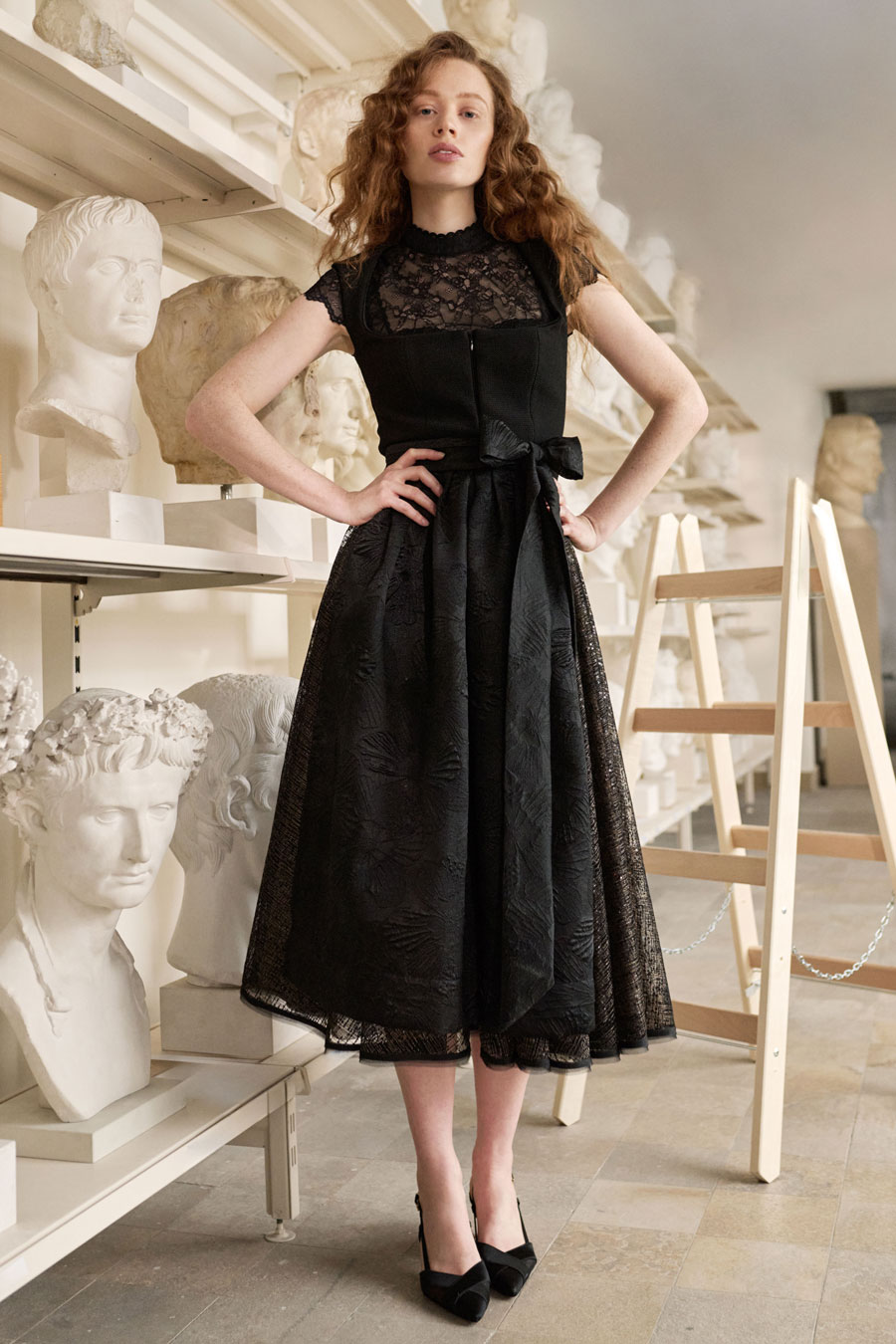 Charakteristische Elemente wie der Balkonette-Ausschnitt, die Korsage und der schwingende Rock erhalten durch innovative Stoffkombinationen und kunstvolle Drapierungen – typisch Talbot Runhof – eine neue Dimension.