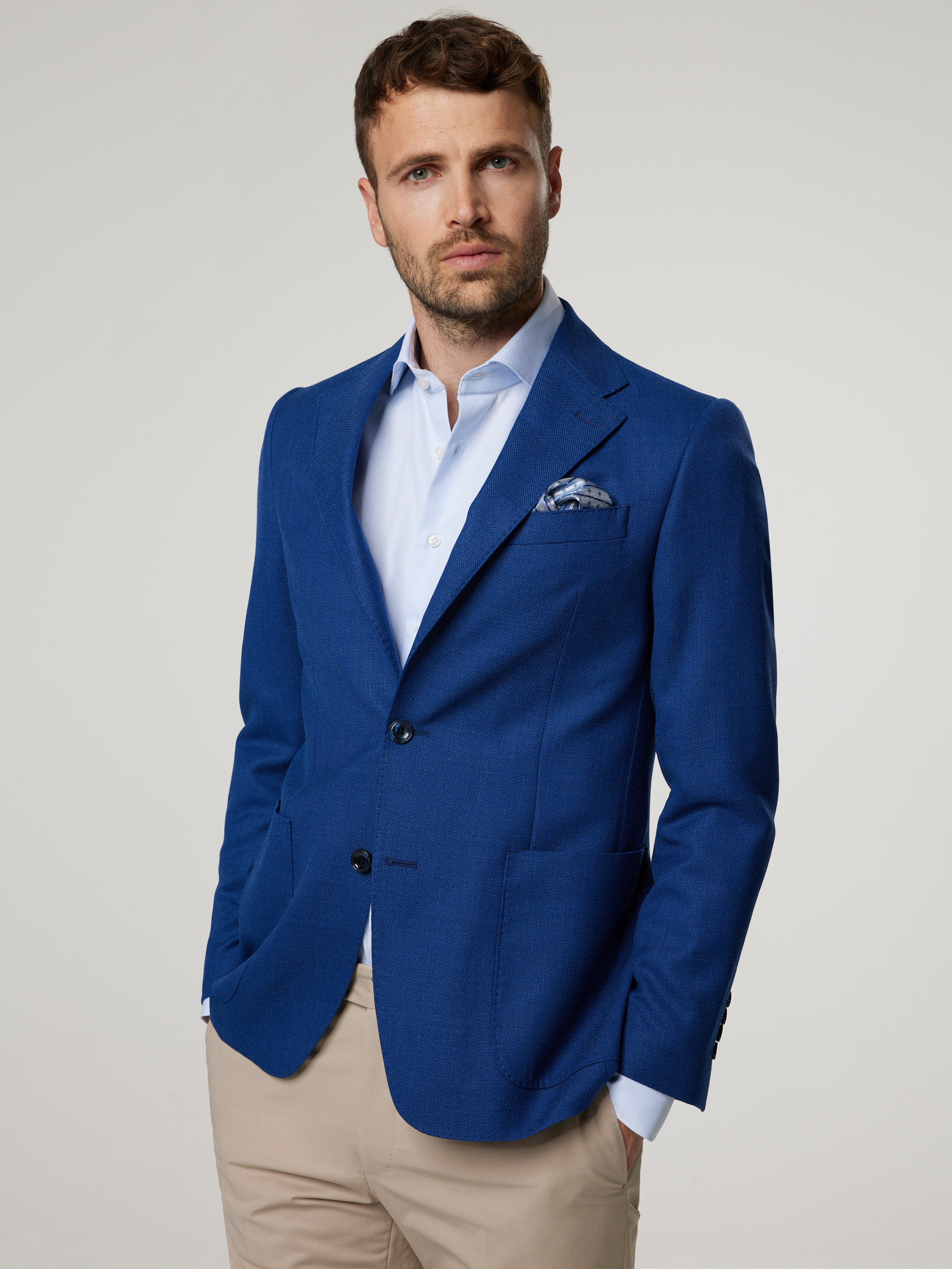 Unser Model misst 187 cm und trägt Grösse 48.