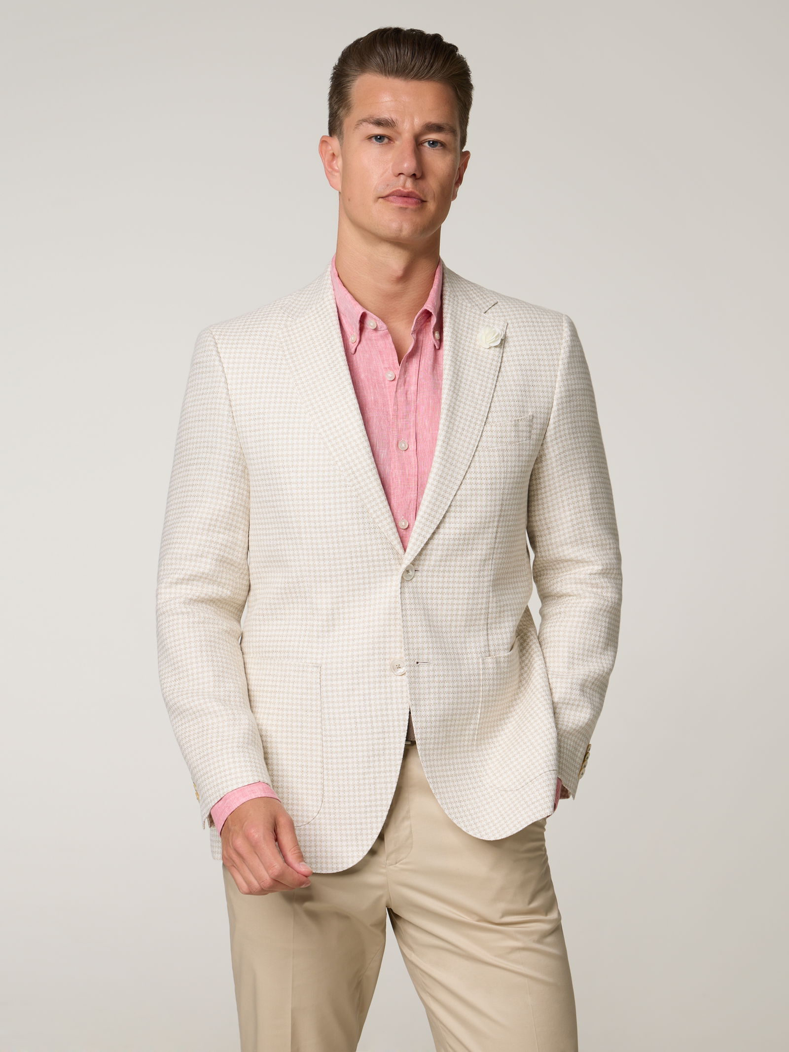 Unser Model misst 187 cm und trägt Grösse 50.