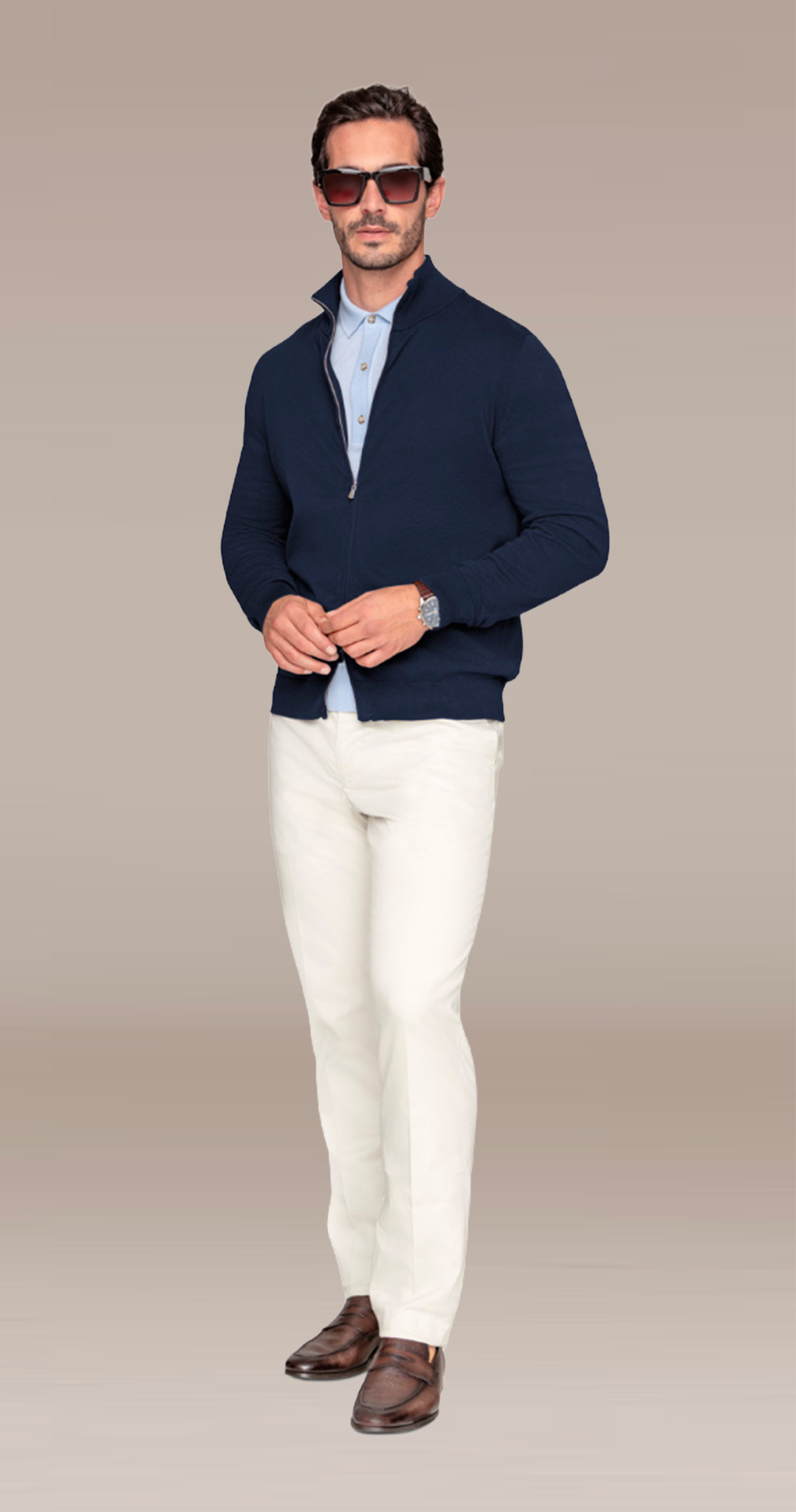 Plus décontracté qu’une tenue semi-formelle, le style casual chic est nettement plus élégant que le casual standard. Les chemises ou tricots de qualité – pull-overs, polos ou cardigans – se combinent avec un blouson, une veste en cuir, une surchemise ou une veste légère et s’accompagnent de chinos de qualité, de jeans classe ou de pantalons cinq poches dans des coloris sobres. Et pour parfaire l’ensemble, des chaussures à lacets, des mocassins ou des baskets soignées en cuir lisse ou en daim dans des tons neutres apportent la touche finale idéale.